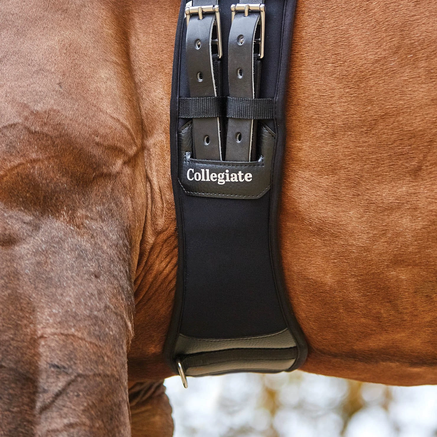The Collegiate Memory Foam Dressage Girth offers ultimate comfort to the horse by utilizing memory foam padding. Roller buckles and dual elastic ends offers easy adjustment. Centre dee ring allows for easy attachment of training equipment.