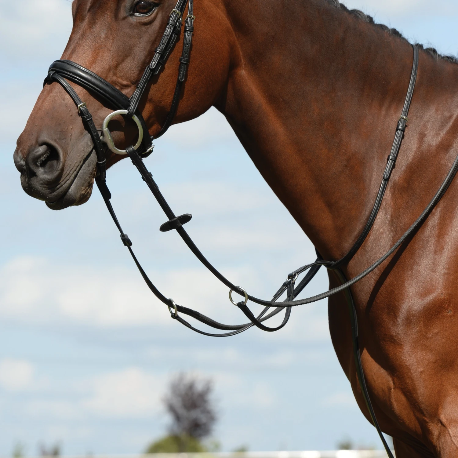 The running martingale features two split straps from the neck strap, with stainless steel rings for the reins to pass through