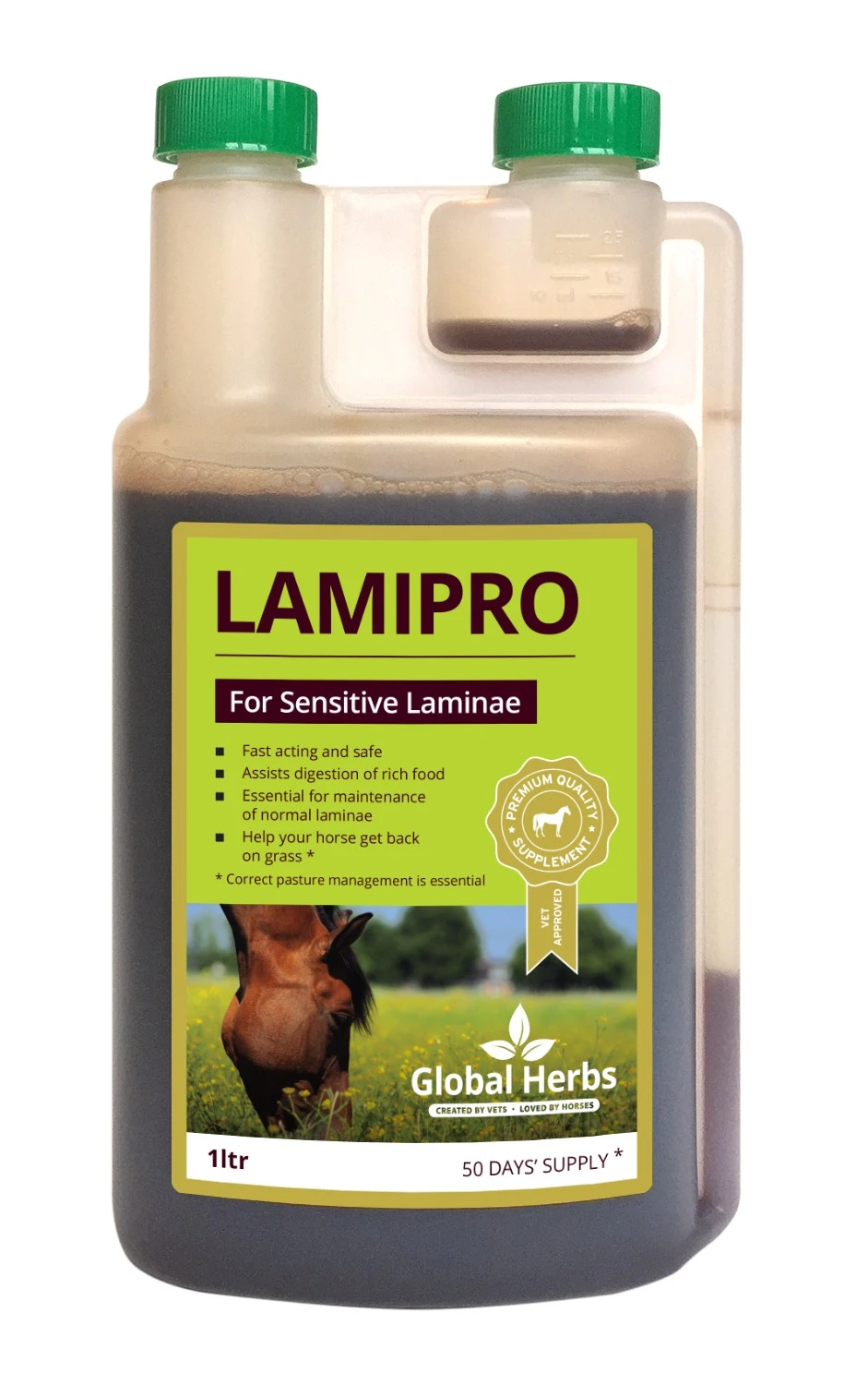 LamiPro Liquid is an advanced, fast acting and unique nutritional approach for horses’ sensitive laminae. LamiPro Liquid soothes horse’s laminae at any time and is particularly useful when there is a flush of spring grass. This palatable herbal supplement works by providing nutritional support for digestion, metabolism, liver function and feed utilisation. This combined action supports and comforts the feet at any time throughout the year. The formula is very quick acting and starts to give nutritional support from the first day fed.