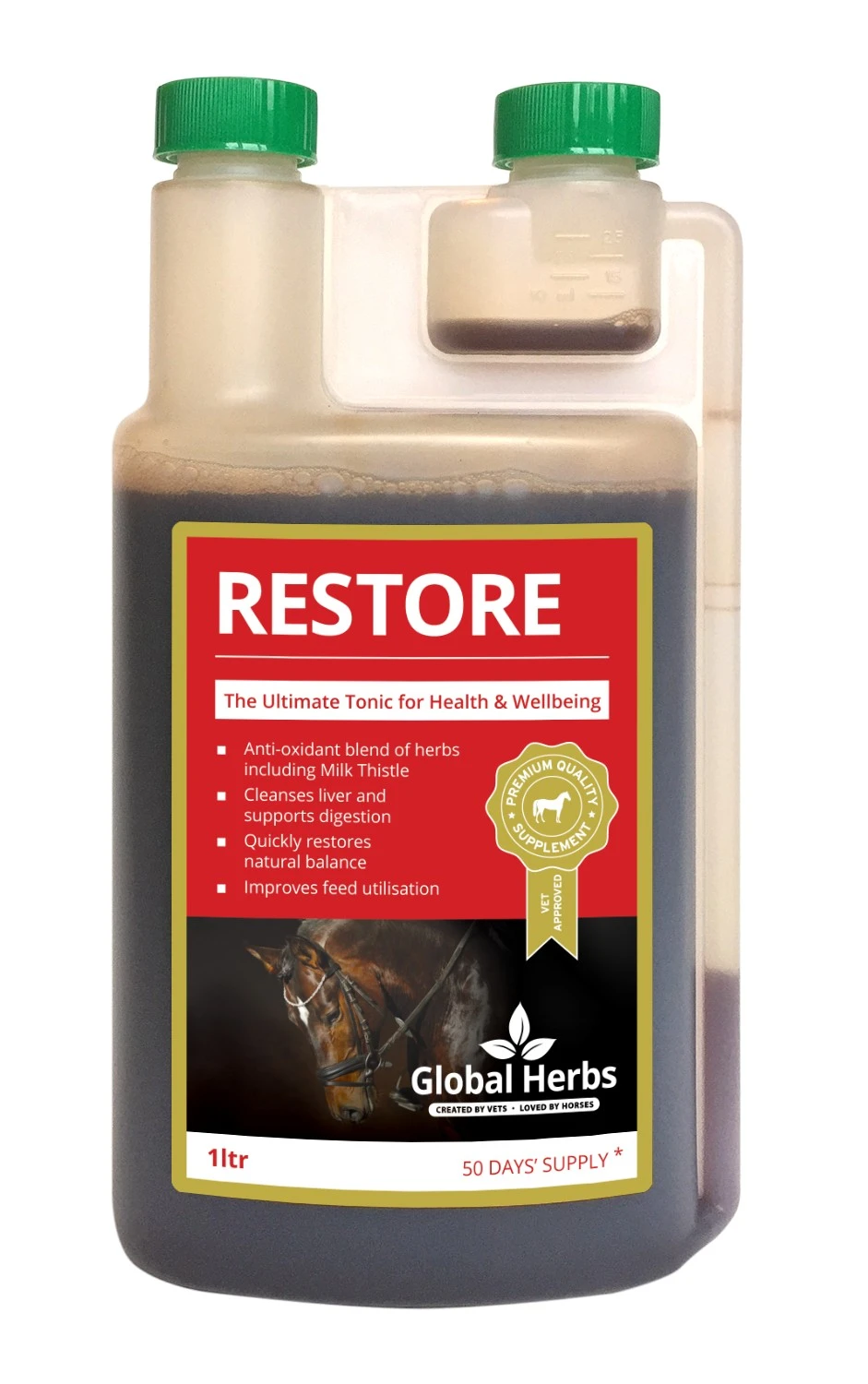 Restore Liquid is the ultimate fast conditioner, liver tonic and ‘pick-me-up’ immune supplement. Restore liquid is fast acting as it is quickly digested. Results can regularly be seen within a very short timeframe. The formula helps to cleanse your horse by supporting the whole digestive system. Specific liver tonic herbs target the liver and whole metabolism to give your horse a ‘competitive edge’. This quick-acting formula helps to maintain peak condition, support efficient digestion and bring out natural shine and colour.