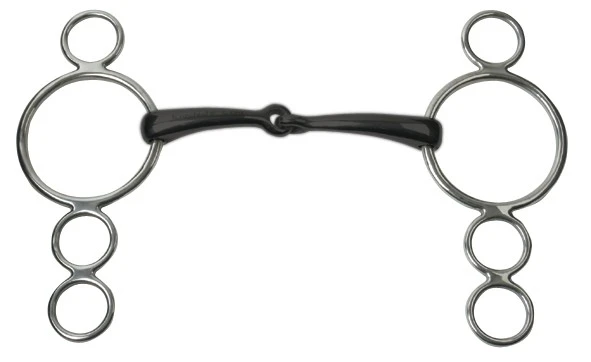 Provides the rider with varying levels of leverage and poll pressure depending on the needs of the horse with the lower ring providing the most leverage. Sweet iron mouth piece is warmer than other metals and encourages salivation and relaxation. The single joint applies a nut cracker action which applies pressure to the tongue, the bars of the mouth and the horse’s palate.