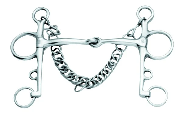 The Pelham bit combines the function of a snaffle and the action of a curb bit. The top rein provides snaffle pressure to the tongue and corners of the mouth, while the bottom rein increases leverage and curb chain pressure. The single joint applies a nut cracker action which applies pressure to the tongue, the bars of the mouth and the horse’s palate.