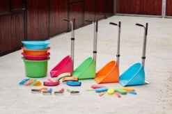 Sturdy plastic feed bin. Metal hooks to hook over stable door or field gate.