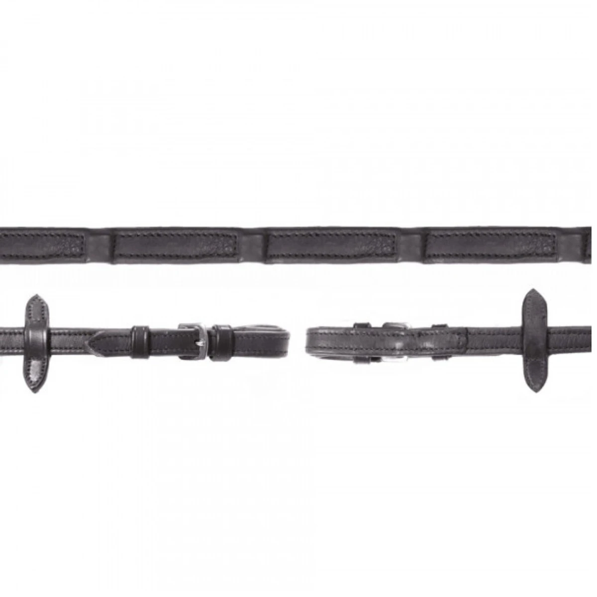 These innovative and new reins have a tear-resistant nylon core. Reins and rein loops are lined with a sturdy webbing. The quality of the core fabric is comparable to the material of seat belts. The leather is durable but also exceptionally soft and smooth. Incorporated stoppers ensure a secure postion in the hands. The reins are fitted with martingale stops and 18mm wide.
