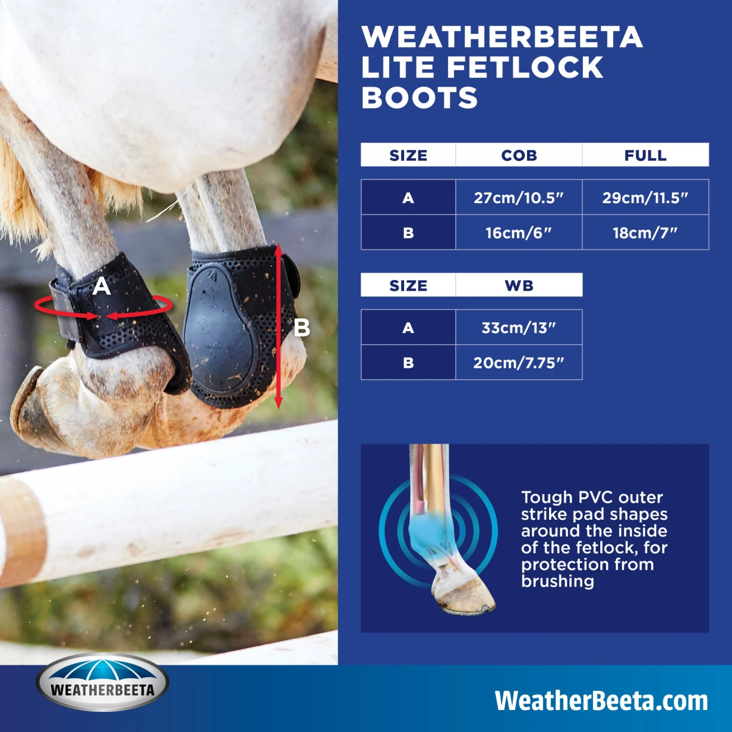 The WeatherBeeta Lite Fetlock Boots are lightweight fetlock boots that are shaped to the horse’s leg for comfort & protection. The tough PVC strike pad shapes around the inside of the fetlock for protection from knocks and brushing. It features a soft, durable & breathable Pro Mesh TPU outer for maximum protection. With a breathable micro perforated neoprene lining that contours to the leg for the perfect fit & comfort and a secure, easy to use sandwich closure.