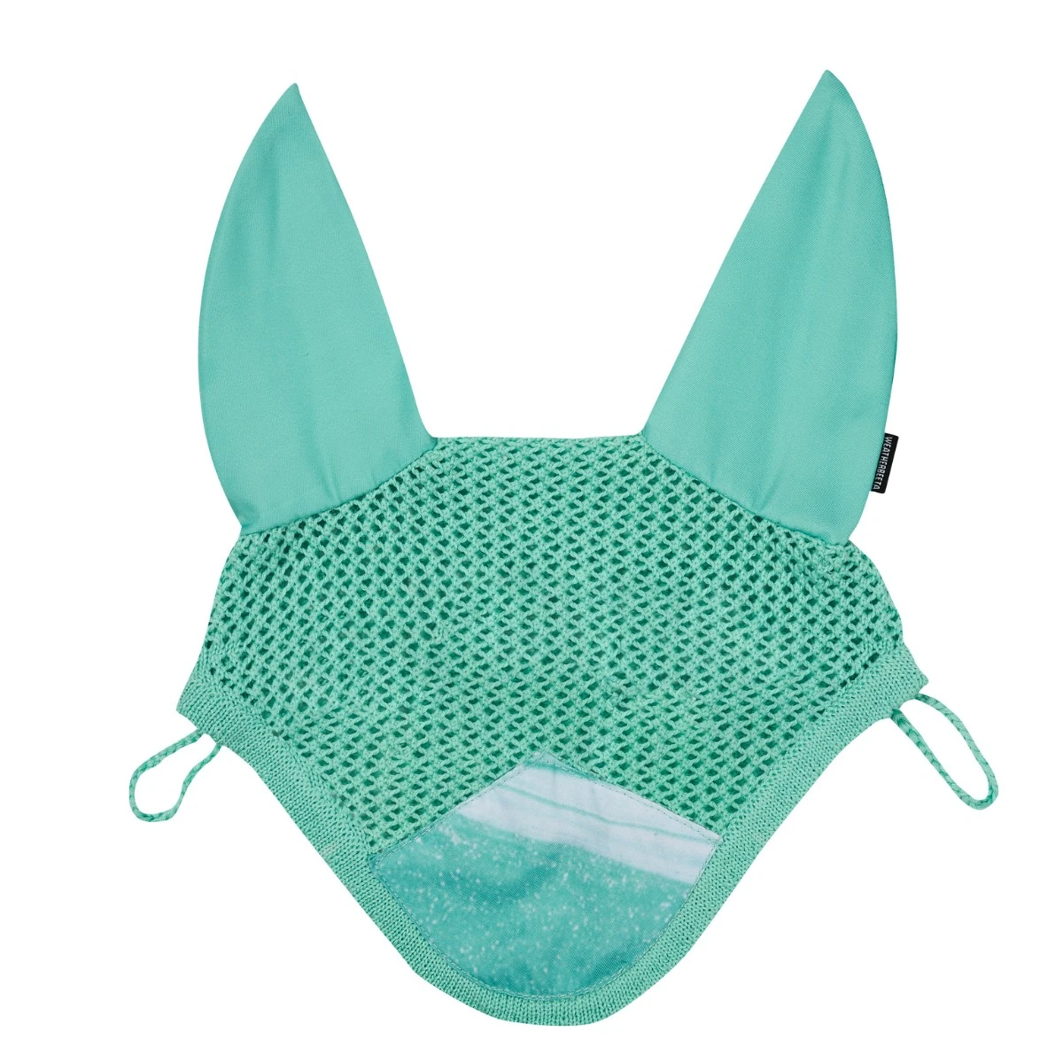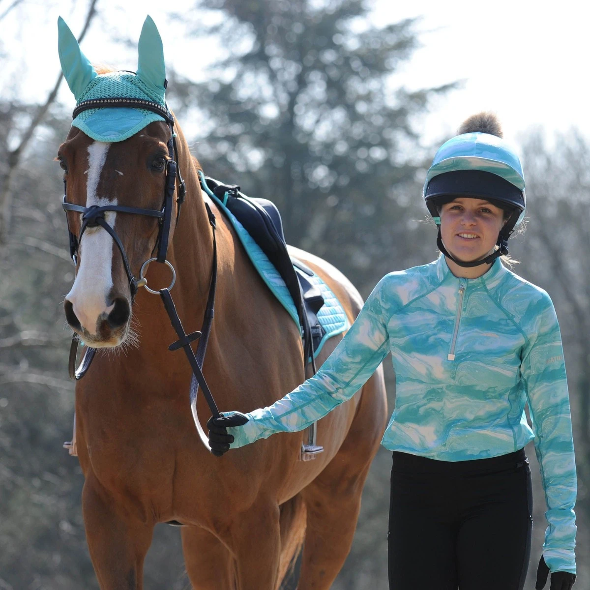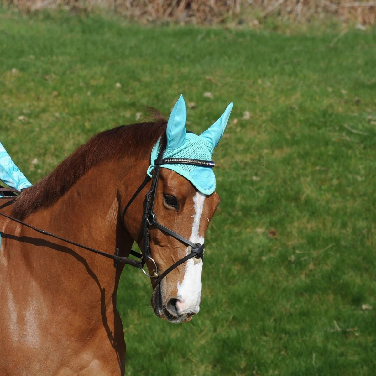 Crochet ear bonnet with high density cotton drill ears for noise reduction featuring a vibrant marble print. Loops on both sides to secure the bonnet to the bridle. Matching range available.