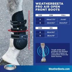 The WeatherBeeta Pro Air Open Front Boots have a lightweight, tough & durable outer with a breathable micro perforated neoprene lining that contours to the horses leg for maximum comfort & protection. They feature vents for breathability from the inner layer through to the outer shell.