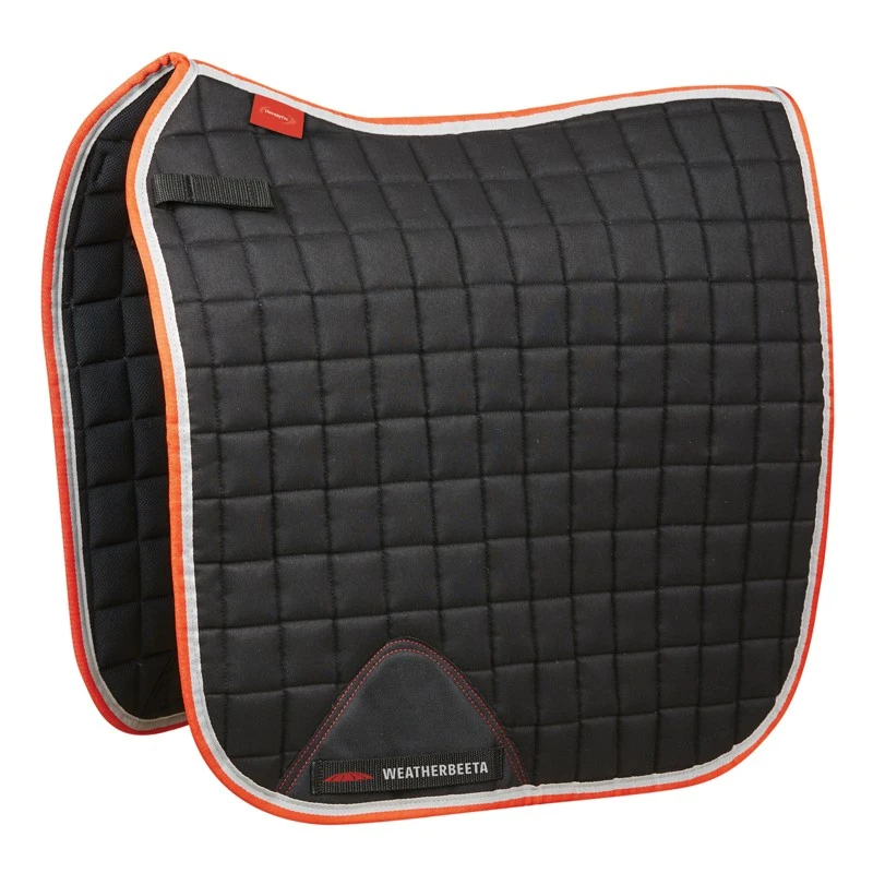 The WeatherBeeta Therapy-Tec Dressage Saddle Pad is a polyester quilted saddle pad with 450g polyfill and ceramic lining. The cut back wither design works to reduce pressure over the wither and the breathable mesh spine allows for airflow to the horse’s back. Great to use during exercise for cold backed horses. The PVC covered girth patch offers durability and the touch tape girth loops allow for a versatile fit. Easy attachment to the D-rings is made simple with short touch tape loops for a secure fit and the high wither design allows for extra space to assure maximum comfort for the horse. Machine washable at 30 degrees, DO NOT tumble dry. Matching range available.